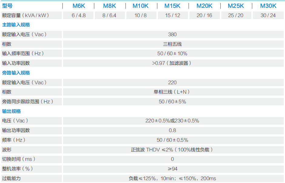 工作方式:三进单出工频在线式;功率范围:6kVA~30kVA
