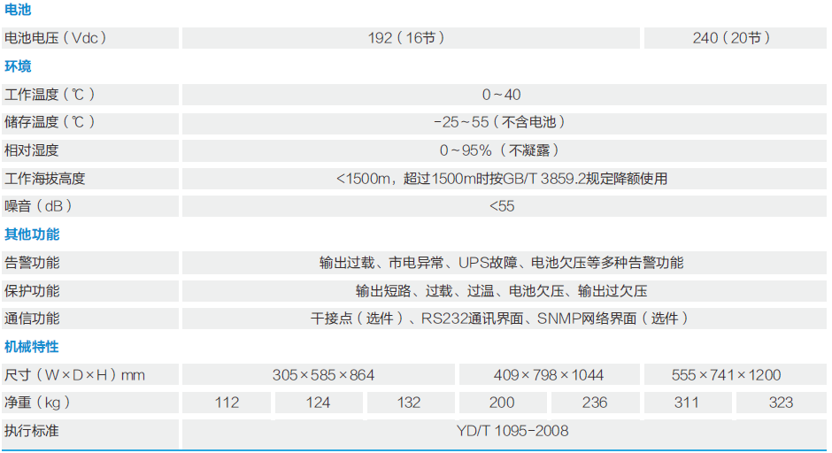 产品核心特点 高可靠性设计 双变换在线式设计 输出零转换时间 负载保护能力强 机内自带输出隔离变压器,抗干扰 能力强 极小的零地电压差,保护设备的安 全运行 负载兼容性好,可以适用各种不同类型的负载 环境适应性强 宽广的电压输入范围,避免频繁地切换至电池供电 UPS的输入频率范围大,保证接入各种燃油发电机均可稳定工作 电池优化性能高 采用智能电池管理技术,延长电池使用寿命 三段式充电技术,最大限度活化电池,节省充电时间 保护周全可靠 开机自诊断功能 输出过载、输出短路,逆变器过温、电池欠压预警和电池过充电保护功能 静态电子旁路开关 直流启动功能 网络管理人性化 中/英文(可选)LCD显示面板 RS232接口通讯 SNMP适配器(选配) 技术参数