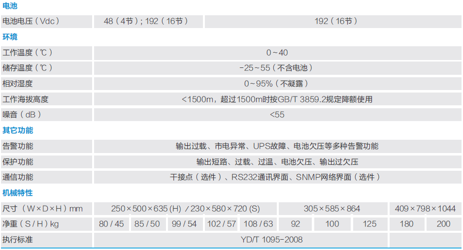 产品核心特点 高可靠性设计 双变换在线式设计 输出零转换时间 负载保护能力强 机内自带输出隔离变压器,抗干扰能力强 极小的零地电压差,保护设备的安全运行 负载兼容性好,可以适用各种不同类型的负载 环境适应性强 宽广的电压输入范围,避免频繁地切换至电池供电 UPS的输入频率范围大,接入各种燃油发电机均可稳定工作 电池优化性能高 采用智能电池管理技术,延长电池使用寿命 三段式充电技术,最大限度活化电池,节省充电时间 保护周全可靠 开机自诊断功能 输出过载、输出短路,逆变器过温、电池欠压预警和电池过充电保护功能 静态电子旁路开关 直流启动功能 网络管理人性化 中/英文(可选)LCD显示面板 RS232通信接口 SNMP适配器(选配) 技术参数