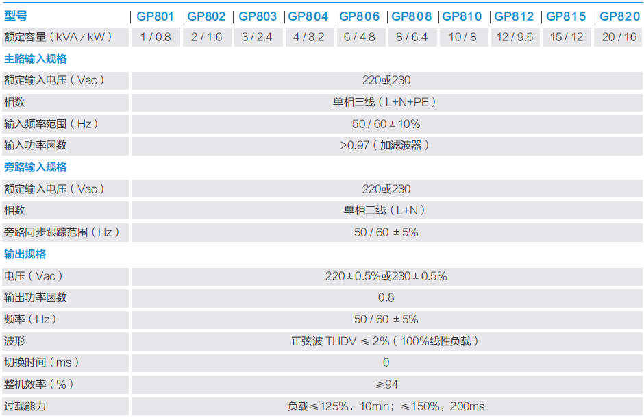 工作方式:单进单出工频在线式;功率范围:1KVA~20KVA